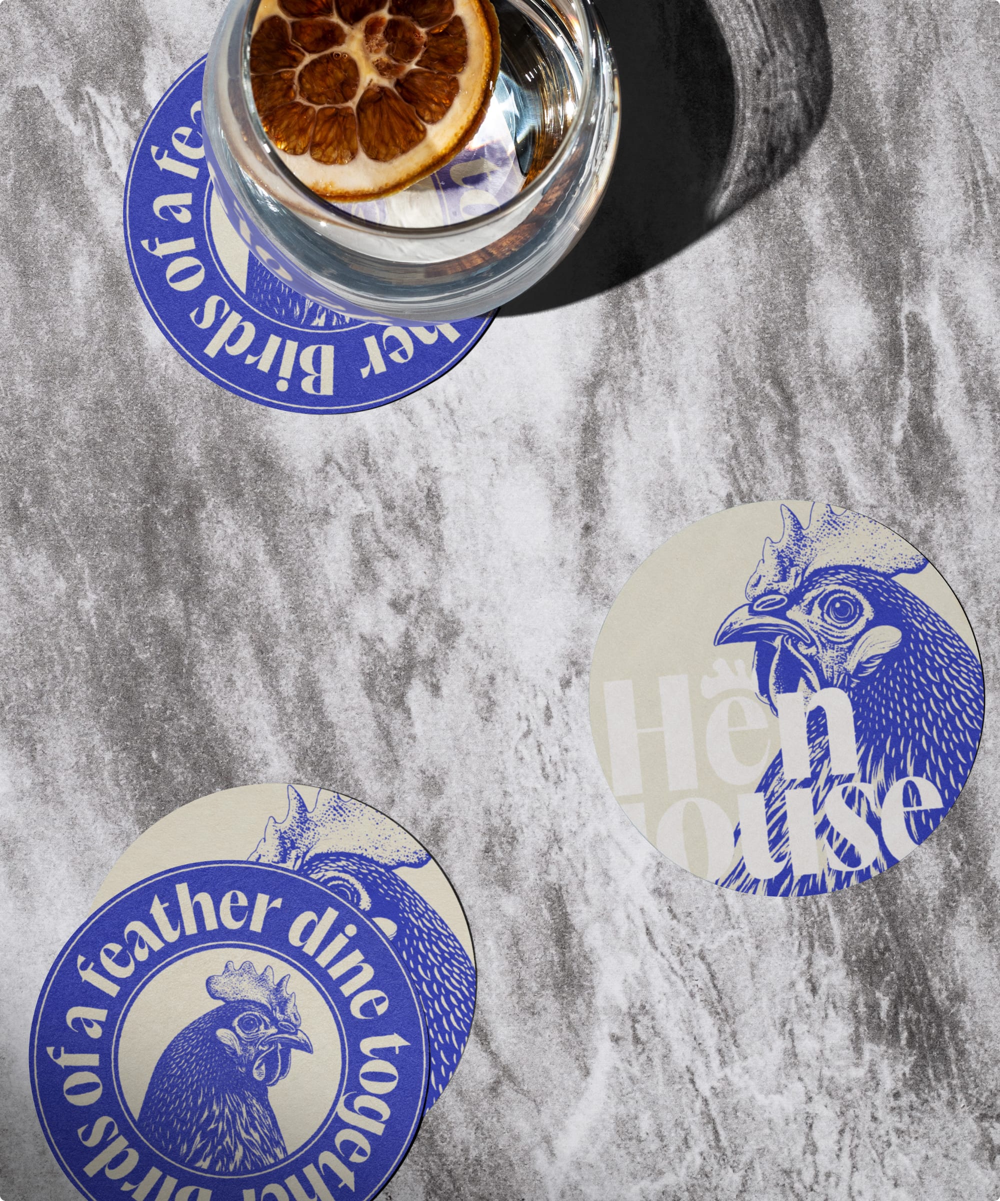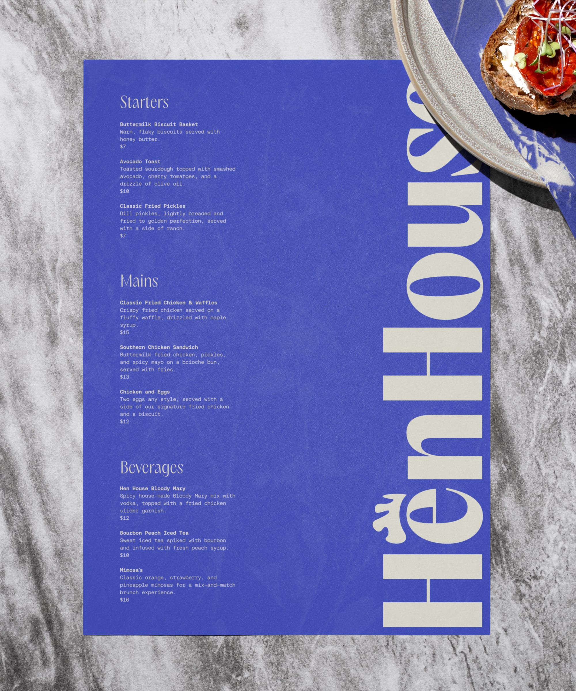 The visual strategy centers around incorporating playful chicken-themed embellishments that reflect the restaurant's signature dish while adding charm and character to the overall identity. A bold, unexpected color palette was chosen to create a striking visual contrast, setting Hen House apart from traditional brunch spots and evoking a sense of fun and sophistication.